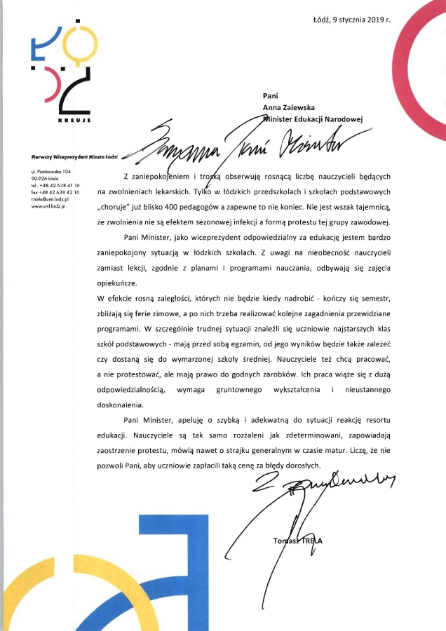 List z apelem do Minister Edukacji Narodowej Anny Zalewskiej wystosował Wiceprezydent Miasta Łodzi Tomasz Trela. Podkreśla w nim zaniepokojenie rosnącą liczbą nauczycieli przebywających na zwolnieniach lekarskich i apeluje o wypracowanie porozumienia dla dobra dzieci.